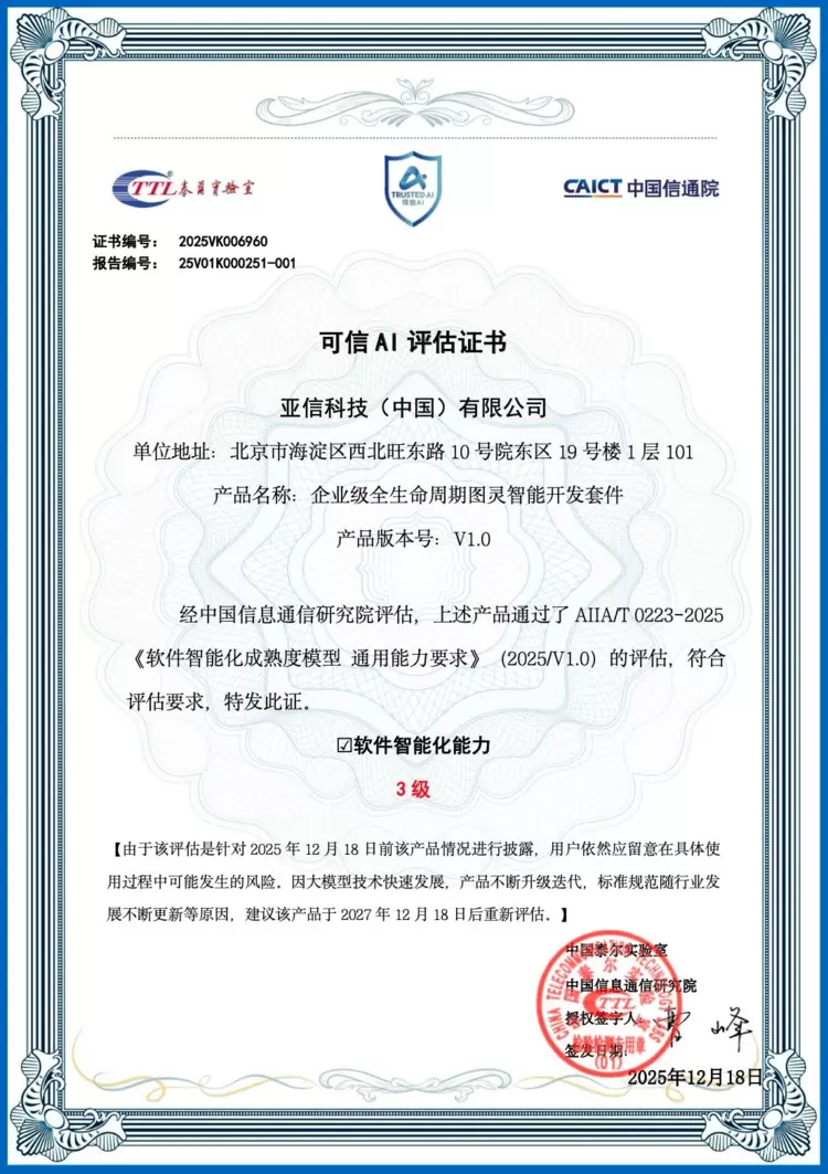 首批!亚信科技通过中国信通院“可信AI”软件智能化能力三级评估
