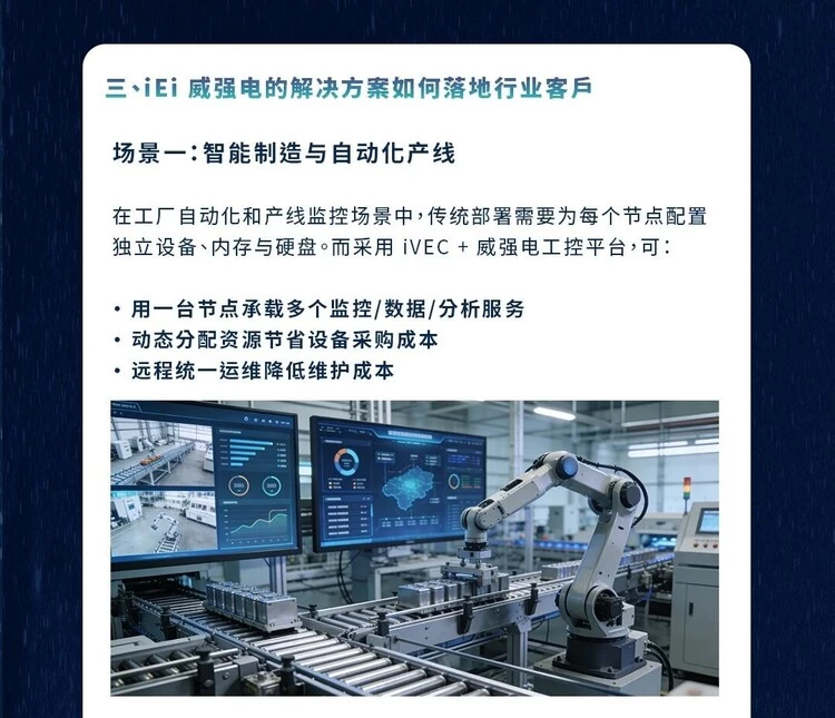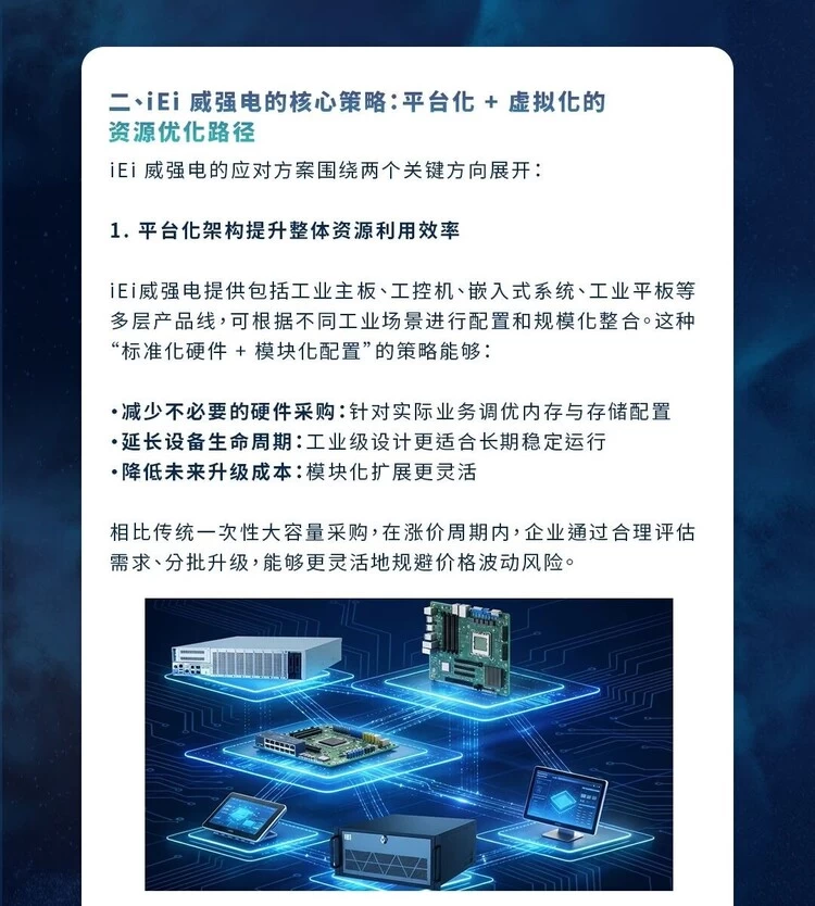 在这种大环境下,传统通过单机堆叠式资源扩展的方式已显局限,很多企业正在寻求更"精细化"的资源利用模式:不仅要控制成本,还要确保系统稳定、可扩展、可长期运维。作为深耕工业计算与边缘智能领域多年的技术供应商,iEi威强电基于自身完整产品矩阵与平台化策略,提出了一套兼顾"硬件效率提升与整体成本优化"的解决方案框架,帮助客户在涨价浪潮中稳住供应与预算。