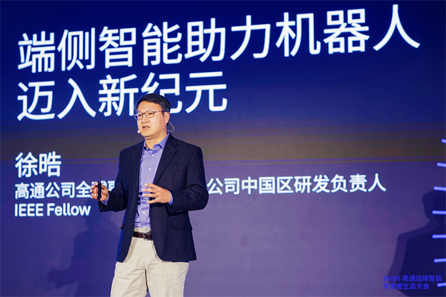 会上,高通公司全球副总裁、中国区研发负责人徐晧分享了高通在终端侧 AI 与边缘智能领域的前沿洞察,并结合机器人这一物理 AI 的重要落地形态,阐述了机器人技术的演进趋势。他指出,终端侧 AI 与边缘智能正成为推动产业演进的关键方向,在实时性、隐私保护和能效方面展现出明显优势。随着机器人等应用场景不断扩展,AI 正走向真实物理世界,对计算能力、功耗控制以及系统级协同提出了更高要求。围绕这些需求,高通持续完善面向终端与边缘的产品技术平台,同时也高度重视开发者生态建设,通过平台能力、工具链以及与生态伙伴的协同,助力开发者和生态伙伴更高效地推进机器人等应用的落地。