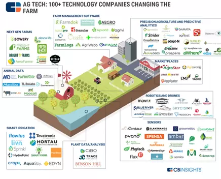 【全球知名的风投机构CBinsights评选的百家农业科技企业中,已经很少有农化类型企业,更多的是智能灌溉、农业物联网和无人机、精准农业等领域的智慧农业相关企业。】