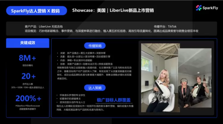 钛动科技与LiberLive的合作,完整诠释了如何系统化地助力一个“概念驱动型科技潮牌”实现冷启动与破圈增长。如何将一款打破百年传统、形态颠覆的无弦吉他,推向以成熟和保守著称的欧美乐器消费市场,并避免其被归类为“玩具”或“极客小众产品”呢?在定义共识阶段,钛动科技首先将LiberLive从“一款硬件”重新定位为“一种音乐表达的新范式”,所有传播均围绕“Democratizing Music Creation”(让音乐创作大众化)这一核心主张展开;在构建共识阶段启动“音乐创作者共振计划”,钛动科技合作了超过20位包括超头部音乐人在内的多元化达人,一位拥有数百万粉丝的音乐制作人发布深度测评,探讨其如何改变工作流,一位流行歌手用它进行即兴创作并发布片段,众多中腰部创作者则展示了从零开始的学习过程,而这些内容均在TikTok上形成了立体环绕式的叙事网络;而在共识引爆阶段,借助黑五这一全民购物心智窗口,钛动科技将所有叙事收束,发起“黑五音乐创作派对”整合营销。通过精准的广告组合与流量投放,将前期积累的高度意向人群集中转化。达人内容中的专属优惠信息与独立站链接形成闭环,最终不仅显著拉动了销售,更让LiberLive在目标社群中稳固建立了先锋、友好、充满创造力的品牌形象。