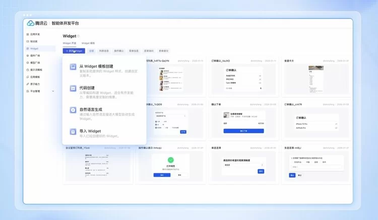 当前国内的智能体平台构建Widget时,普遍采用传统“拖拉拽式低代码+手动配置字段/数据源映射关系”的方式,流程繁琐、耗时久、稳定性一般,难以适配高效开发的需求。针对这一痛点,腾讯云ADP推出的AI原生Widget,提供了模版创建、代码创建、自然语言生成等多种方式,降低开发门槛。即使非专业前端开发者,只需用语言描述需求,或调用现成Widget模板,一分钟内就能够生成对应组件,真正实现“所想即所得”。
