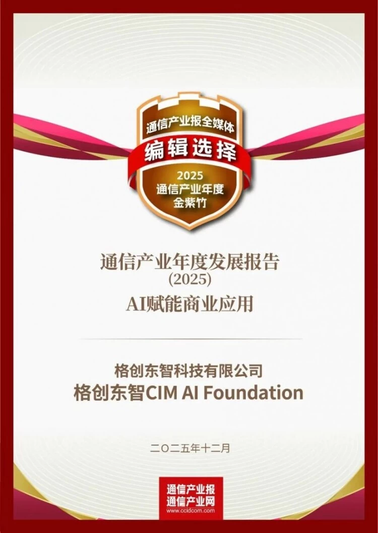 近日,通信产业报正式发布《通信产业年度发展报告2025》暨年度产业图谱。格创东智作为由TCL战略孵化、聚焦泛半导体行业的工业AI领军企业,凭借自主研发的CIM AI Foundation入选“AI赋能商业应用”类别,并获得2025年度通信产业年度金紫竹的编辑选择,彰显了公司在工业AI技术与应用领域的市场影响力和行业认可度。