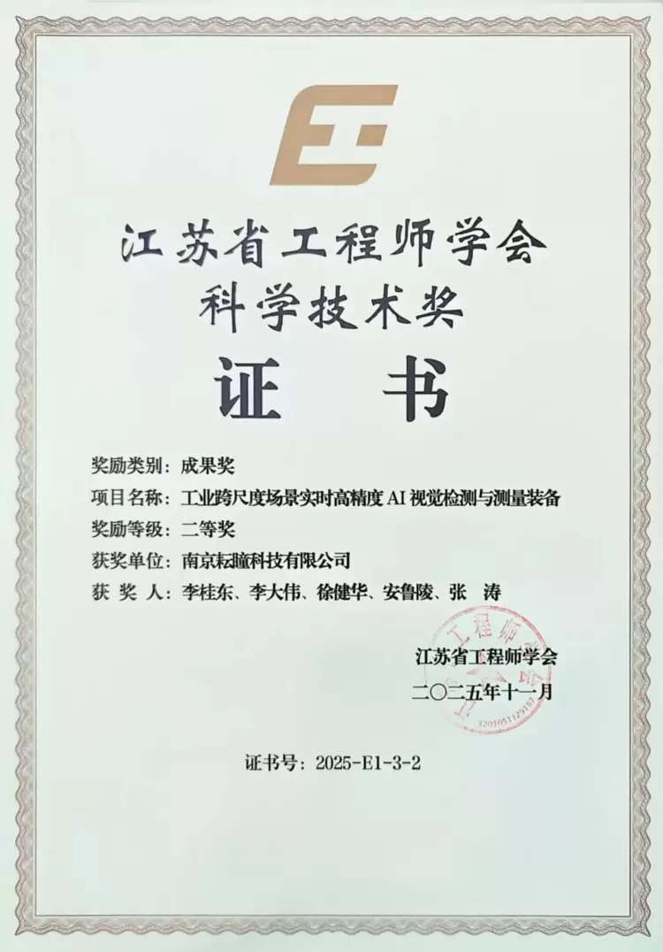 近日,第六届江苏工程师大会在南京成功举办,会上表彰了2025年度江苏省工程师学会科学技术奖获奖项目与获奖者。南京耘瞳科技有限公司(以下简称“耘瞳科技”)凭借其核心产品“工业跨尺度场景实时高精度AI视觉检测与测量装备”,荣获江苏省工程师学会科学技术奖成果奖二等奖。
