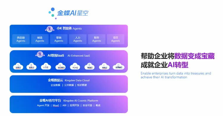 在AI重构企业管理的新时代,金蝶AI星空套件以新一代企业级AI平台为核心底座,依托金蝶数据云的企业数据、公域数据与知识图谱构建坚实支撑,创新采用“AI增强SaaS” 模式,通过嵌入式“小 K”与“小K智能体”双引擎,将AI能力深度融入企业业务全流程、全场景,实现从单点提效到业务闭环赋能的跨越,真正让AI在管理场景中落地生根,驱动企业全价值链效率革新。