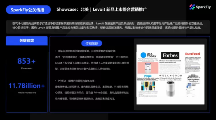 在新品上市前夕,团队集中火力于媒体攻坚。钛动科技围绕新品突破性的“全屋沉浸式静净体验”概念,策划了深度传播包。通过精准的媒体关系维护与热点借势,钛动科技成功在北美主流消费科技及生活类媒体中引爆话题。项目累计斩获超过853篇次优质媒体placements,创造了逾117亿次媒体印象。这一阶段,Levoit成功从“又一家空气净化器公司”,跃升为被主流舆论场认证的“家居健康空气赛道的重要定义者”。