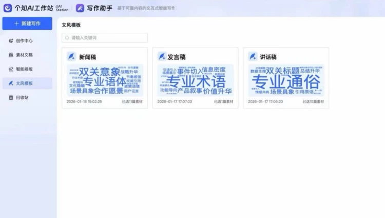 "个知·智能工作站"写作助手文风管理功能示意