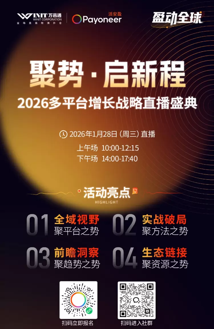 为帮卖家破解多平台布局难题,精准把握2026年行业趋势,万邑通与Payoneer派安盈携手,于1月28日上午10:00开启“聚势·启新程——2026多平台增长战略”主题直播,邀你共探多平台增长之路!
