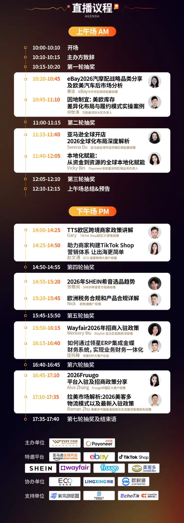 本次直播邀请了亚马逊全球开店、eBay、TikTok Shop(欧洲)、SHEIN、Wayfair、Fruugo、美客多七大跨境电商平台及欧税通、宜客跨境、领星ERP等生态合作伙伴,以汇聚不同平台的流量之势、新兴市场的增长之势、多元化布局的抗风险之势,帮助跨境卖家破解生意增长瓶颈,在行业变局中找准方向、抢占2026年多平台增长先机。