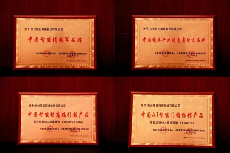 行业身份升级的同时,萤石迎来品牌与产品荣誉的双重丰收。品牌方面,萤石斩获由中国日用五金技术开发中心、奥维云网联合颁发的“中国智能锁领军品牌”与“中国锁具行业消费者优选品牌”两大品牌类殊荣。在产品类评选中,萤石启明Y5000FVXUltra凭借突破性的技术创新,获评“中国智能锁高端引领产品”,热售型号Y5000FVX则以卓越的市场表现与优质的AI交互体验,荣获“中国AI智能门锁畅销产品”称号。