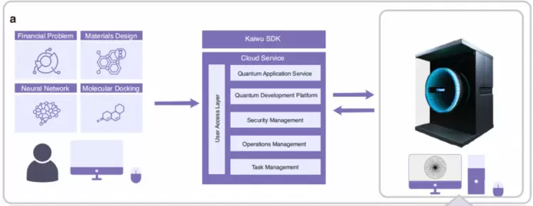 a图:相干光量子计算服务作业流程示意图。完整流程包括用户向云服务器提交计算任务(如分子对接、金融分析、神经网络和材料设计),云服务器将这些任务转换为伊辛模型矩阵,并通过Kaiwu SDK传输至相干光量子计算机。FPGA连接本地计算机,利用获取的伊辛模型矩阵进行计算。