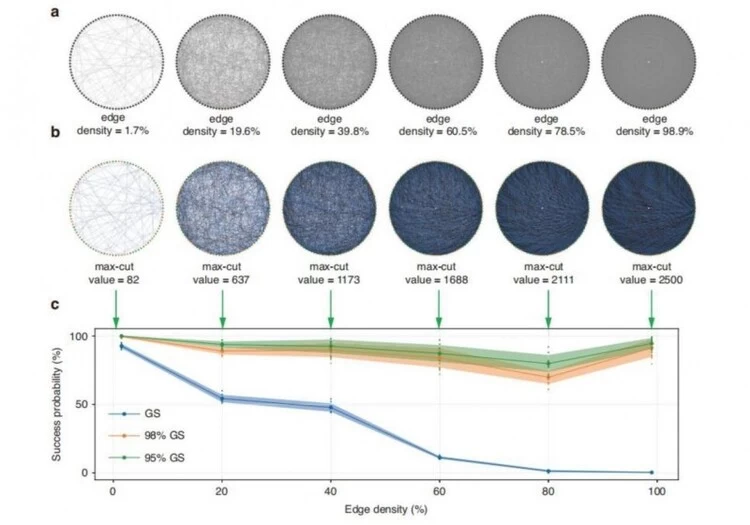 研究的关键突破在于采用飞秒激光泵浦技术构建相干光量子计算系统,并在光学设计与结构稳定性上进行了协同优化。这种飞秒脉冲具有极高峰值功率,不仅增强了非线性光学效应和量子行为表现,还降低了光纤系统中所需的平均泵浦功率,从而提升能效与系统可靠性。实验以包含100个顶点的莫比乌斯图(MöbiusLaddergraph)为测试基准,成功实现了55%的平均最优解成功率,相比之前最好水平提升了2倍以上。同时该系统在连续8小时运行中保持了高成功率,充分验证了相干光量子计算机在长时间、高稳定性工业级应用场景中的可行性。