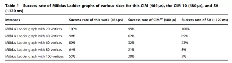 表1:基于CIM(464 μs)、CIM 10(480 μs)及SA(~120ms)计算不同顶点大小的莫比乌斯梯形图的成功率