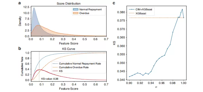 c图:随着α参数的增加,量子特征选择CIM+ XGBoost模型的KS统计量持续上升。当α值超过0.99时,该量子特征选择模型的性能已超越未进行特征选择的XGBoost模型。