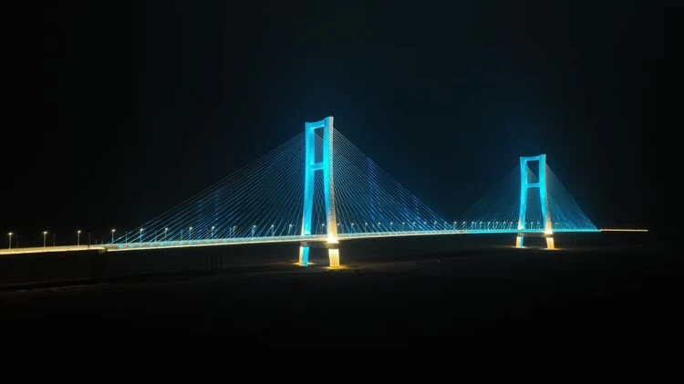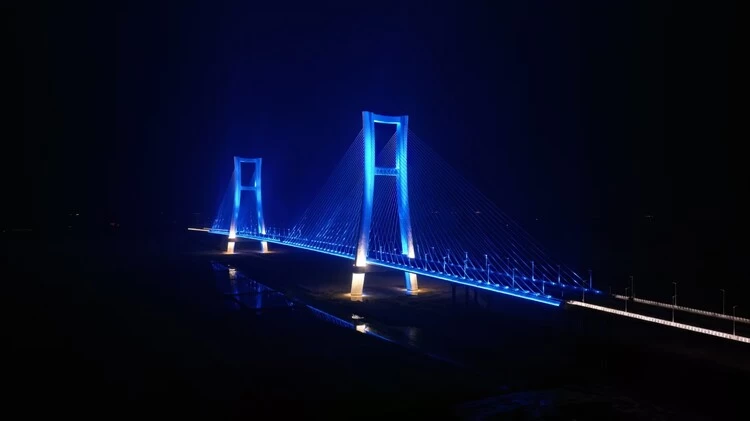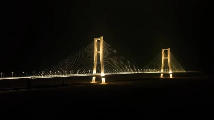 在保障功能照明的同时,项目通过在桥头堡、栏杆下檐、主塔斜拉索等关键位置布置洗墙灯与投光灯,结合可编程LED灯光与智能调光技术,实现光色自由变幻,塑造出大桥独特的夜间形象。夜幕下,大桥宛如一条流光溢彩的丝带,为黄河天际线增添了一道科技与美学交融的风景。