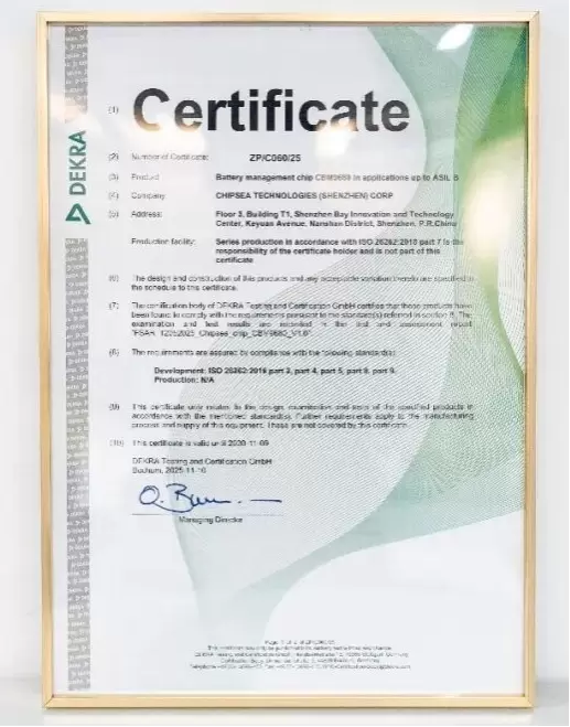 1月21日,芯海科技(股票代码:688595)面向汽车12V启动锂离子电池系统的BMS芯片CBM9680,荣获由国际检验检测认证机构DEKRA德凯颁发的ISO 26262功能安全ASIL-B等级认证。此次认证标志着该芯片将为锂电替代铅酸电池的汽车启动系统变革提供高可靠、高安全的核心芯片保障。