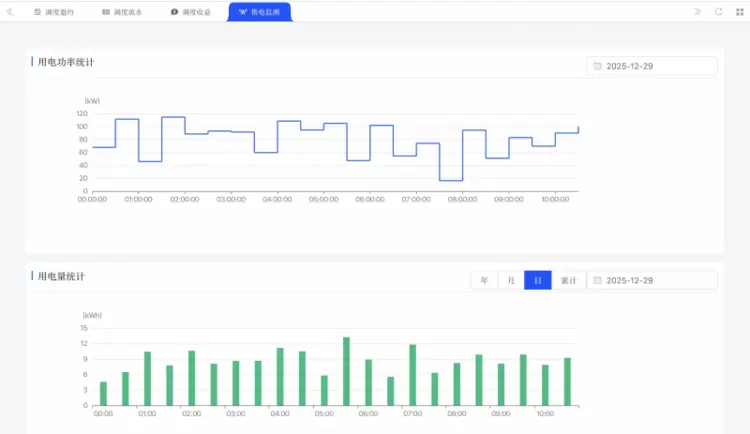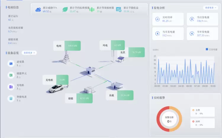 全景监测与能效分析:实时监测各电站发电/用电曲线,自动计算自发自用率、绿电占比等核心指标。