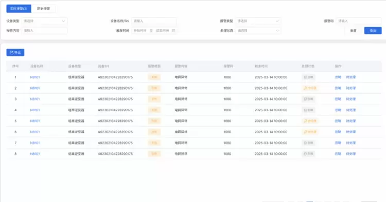 运维管理中心模块通过对电站运行状态的系统性监测,结合阈值预警与AI诊断模型自动生成告警信息,实现运维模式从“被动响应”向“主动预防”的全面升级,构建起全流程数字化的运维管理体系。