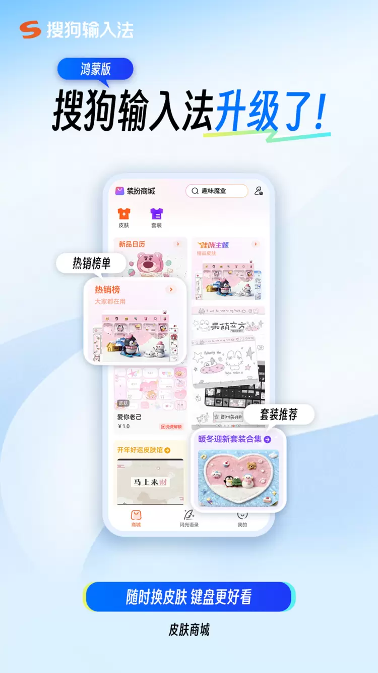 你的键盘,由你做主。鸿蒙版搜狗输入法“皮肤商城”让你轻松实现皮肤自由: