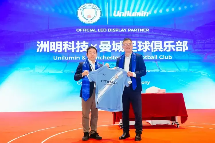 城市足球集团(CFG,曼城隶属于该集团)中国区首席执行官David Tang与洲明集团显示产品线副总裁、中央研究院院长陈黎暄作为双方代表出席仪式并签署合作协议。这标志着继过去逾四年卓有成效的全球性战略合作后,洲明将继续作为曼城足球俱乐部官方LED显示合作伙伴,与这支世界顶尖豪门并肩同行,开启未来合作共赢的精彩序幕。