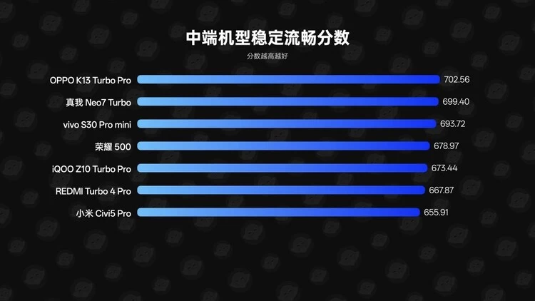 具体数据显示,搭载ColorOS 16的OPPO Find X9 Pro在旗舰机型类别中获得了727.66的高分,而OPPO K13 Turbo Pro在中端机型列表中也取得了702.56的优秀成绩。这些数据充分证明了ColorOS 16在不同价位设备上都能提供一致的流畅体验。