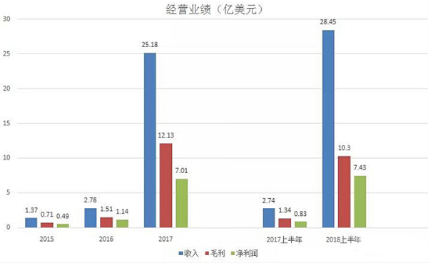 招股书显示,2015年-2017三年间以及2018年上半年,比特大陆实现收入连年增长,涨幅惊人。截止2018年6月30日,比特大陆总收入高达28.45亿美元,毛利达到10.3亿美元,净利润7.43亿美元。收入、毛利和净利润这三项指标与2017年上半年相比,分别达到938.32%、668.66%、795.18%的增长。