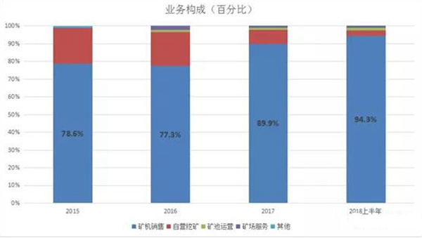 比特大陆的收入主要来源于矿机销售、矿池联运、矿场服务、自营挖矿四大业务。其中,矿机销售占比最大,2018年上半年营收占比高达94.3%;第二大业务自营挖矿占比不断下降,从2015年的20.3%降到2018年上半年的3.3%;矿池运营和矿场服务占比较少。