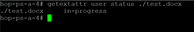 以下是一个相关命令行的简单示例:文件“test.docx”被赋予了一个“status”键,其值为“in-progress”。此处使用的键/值为自定义字段,并可根据需求灵活设置。