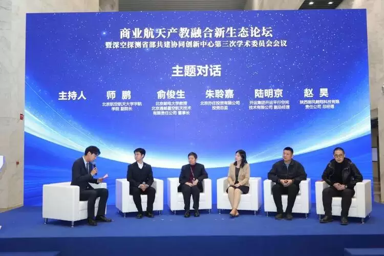 主题对话环节以“星箭应用与人才共育——构建产教融合新范式”为核心,北京航空航天大学宇航学院副院长师鹏、北京邮电大学教授俞俊生、北京亦庄投资有限公司投资总监朱聆嘉、开运集团开运平行空间技术有限公司副总经理陆明京、陕西御风翱翔科技有限责任公司总经理赵昊,从科研院所、企业、投资机构等不同视角,围绕“十五五”期间商业航天产教融合的“平台升级”与创新共同体构建,针对“校热企冷”、产业前沿衔接、技术成果转化、企业人才培养创新等痛点,深入研讨。