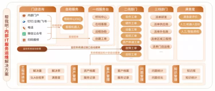 在内部IT运维场景,“帮我吧”构建了统一服务门户+标准化流程体系,显著提升员工服务体验与运维响应速度。结合机器人自助服务与知识库联动,实现“即问即答、即查即解”;并通过BI数据分析报表,将运维管理从“经验驱动”转向“数字驱动”,帮助企业实现运维过程的透明化、可度量与持续优化。
