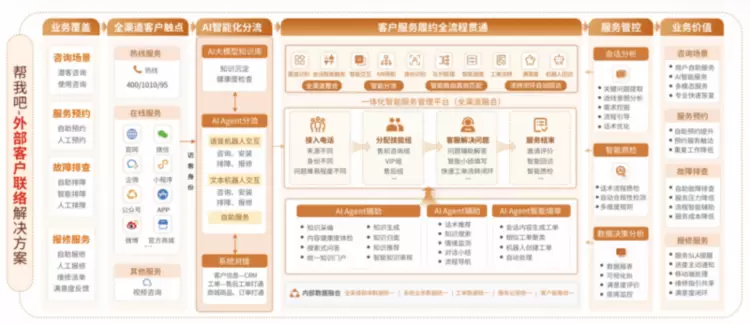 在外部客户服务场景中,“帮我吧”通过全渠道统一受理平台,整合微信、网页、APP、电话等多入口咨询,从根本上避免丢单漏单;搭载的智能客服机器人可实现85%常见问题自助解答,大幅解放人力;加上AI工单自动分类与智能派单,整体服务效率提升可达50%。这让企业不仅能快速响应客户需求,更能通过服务过程的数据沉淀,反哺产品优化与客户经营。