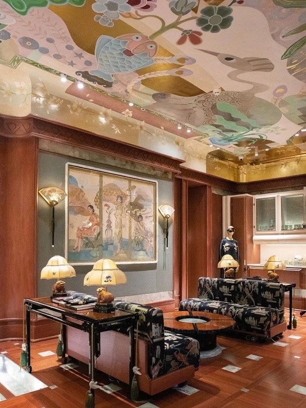 踱步二楼,非遗宋锦以当代语汇融入空间肌体。寸锦寸金的丝缕经纬,经过重新织造与演绎,在墙面、展柜间延续着传统工艺的呼吸。穹顶处,新艺术运动风格手绘凤凰图腾以金箔工笔细细勾勒,鎏金微光隐现。同区静悬艺术家杨宇绢本设色三联屏画《海上繁花》,艺术家以西方水彩的流动氤氲,融汇中国工笔的精微骨法,于细密丝绢上,织就一段属于1920年代的沪上春日想象。