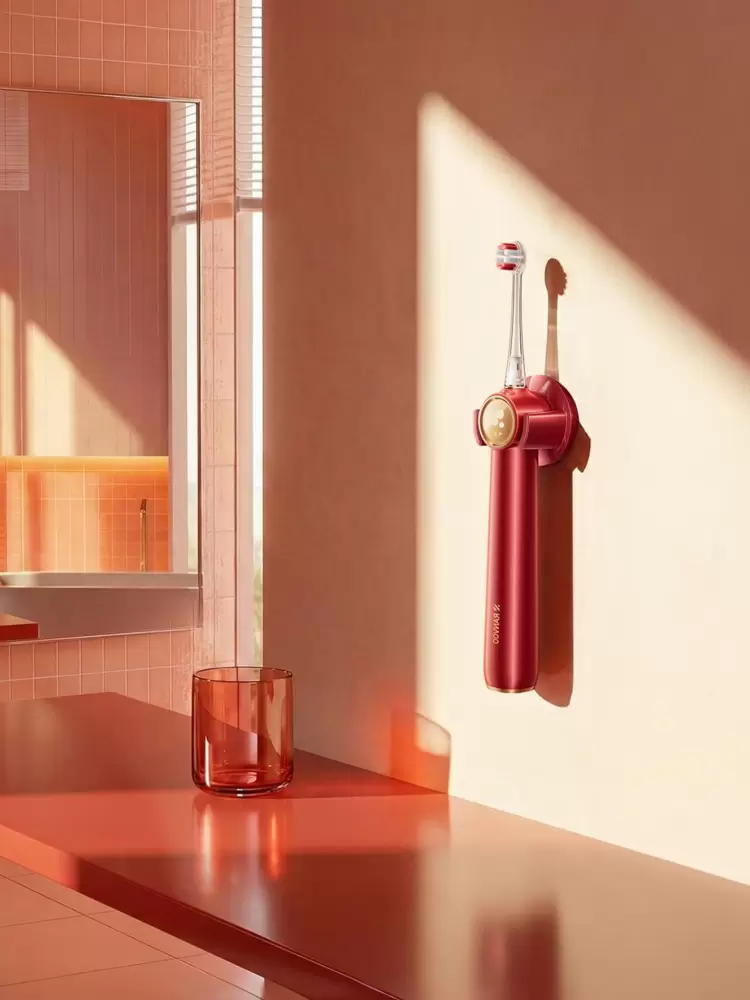 因此,这款电动牙刷产品被赋予了“掌中元气马”的意象。机身设计汲取汉代奔马雕塑的流线形态,握持弧线贴合掌心;专属的“鎏金红”配色,灵感源自古代宫廷非遗鎏金工艺,红金交织,既富丽华贵又不失雅致,象征着红运与丰沛能量。机身上独特的“马蹄金印”屏幕,更是成为画龙点睛之笔,将祝福烙印于方寸之间。开箱的瞬间,从纹样烫金的礼盒到器物本身,完成了一场从视觉到触觉的文化仪式感交付。