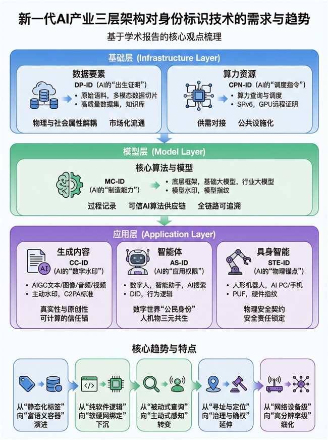 传统的互联网标识大多用于在公共网络中解析寻找资源的地址,而在下一代AI体系中,标识技术的首要驱动力不再是“找不到资源”,而是“管不住资源”,标识技术被赋予了极强的治理属性。例如无论是数据要素ID、算法模型ID还是生成内容ID,其核心目的都是为了确权、溯源和追责。同时,标识也将成为法律法规在技术落地的抓手。通过标识来区分“人类生成”与“AI生成”,通过标识来执行“被遗忘权”。
