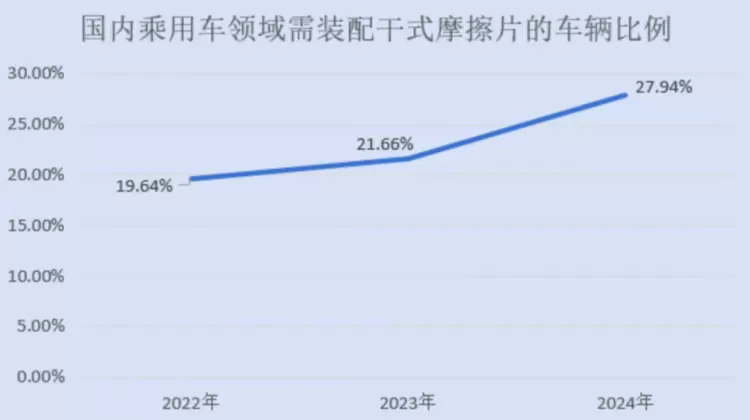 2022-2024 年国内乘用车领域需装配干式摩擦片的车辆比例从 19.64% 升至 27.94%,其中混动车型占比达 21.75%。全球干式摩擦片市场空间稳定超百亿元,2027 年预计增长至 126.13 亿元。