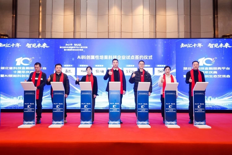活动现场,中信科、武汉光迅、联影医疗、友芝友生物、东风股份、鼎龙股份、飞恩微、芯速联等科技企业代表,武汉大学、武汉科技大学、湖北大学、江汉大学、武汉工程大学、长江大学、武创院、光谷实验室等高校院所代表,以及东风资管、华工创投、国创高投与多家银行机构代表共同参会。平台围绕“AI科创属性培育、AI科技成果转化、AI科技金融”等方向启动试点合作,通过产品试用—场景验证—数据反馈—迭代升级的闭环机制,推动成果“可落地、可复制、可推广”,持续为湖北科创服务生态注入新动能。 会上,平台与武汉产研院达成“AI科创场景概念验证中心”意向合作,将围绕算力、数据、模型与真实场景开展一体化开放验证与孵化,加速AI科创产品从“场景”走向“产品”。现场还以“十年同行者”方式向长期合作伙伴与关键贡献个人致敬,进一步凝聚新十年生态合力