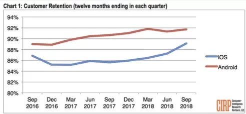 看起来安卓用户换机频率颇高,习惯于“喜新厌旧”,但如果严格来考察忠诚度的话, 结果却并非如此。据CIRP分享的最新统计数据,截止9月份的前12个月,(美国市场)Android用户的忠诚度(用户留存率)为92%,而iOS则是89%。