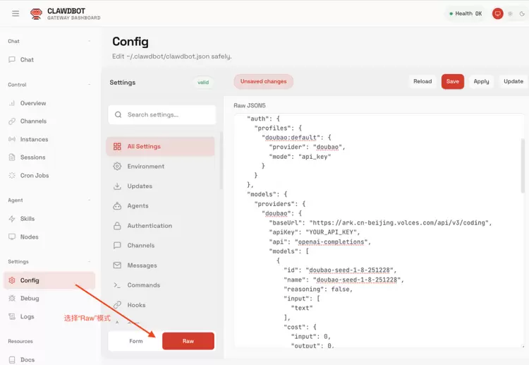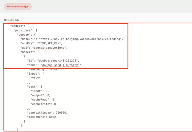 "models":{"providers":{"doubao":{"baseUrl":"https://ark.cn-beijing.volces.com/api/coding/v3","apiKey":"YOUR_API_KEY","api":"openai-completions" }}}面向企业客户: