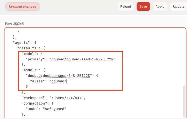 "model": { "primary":"doubao/ark-code-latest"},"models": { "doubao/ark-code-latest": { "alias":"doubao"}}配置模型供应商