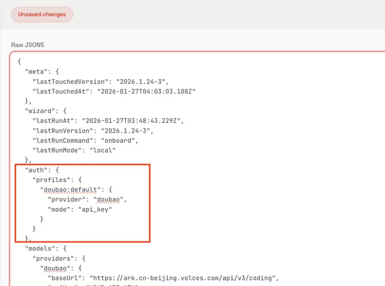 "auth": { "profiles": { "doubao:default": { "provider":"doubao","mode":"api_key"} }}