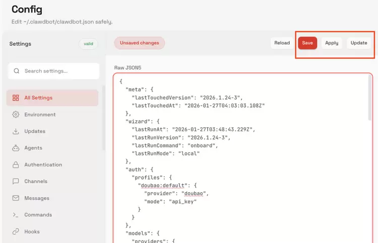 在 MoltBot 配置界面完成修改后,先单击Save,保存完成后单击Update。