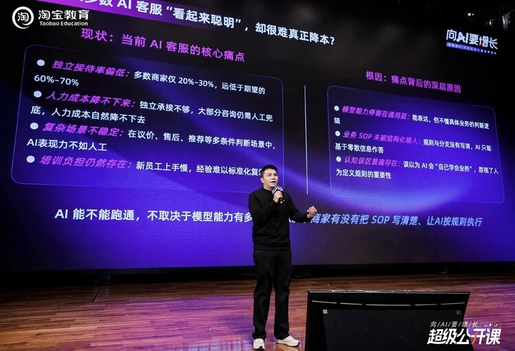 1月22日,「向AI要增长·淘宝教育超级公开课」暨电商AI创新实践大赛决赛在杭州召开,福客AI凭借其在电商客服场景中的深度落地能力斩获“先锋人气奖”以及“潜力之星”。本次决赛围绕电商AI的实际应用与增长价值,淘宝教育联合20位AI实战先锋及淘天核心AI产品团队,基于对200余家真实AI实践商家案例的调研,系统梳理电商经营中的关键应用路径,并在赛事与课程中集中呈现可落地、可验证的实践方向。在这一以真实业务效果为导向的评选与交流背景下,福客AI围绕客服链路给出的解决方案,因其创新性、稳定性与可执行性获得认可。