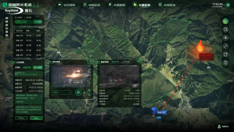 在理念指引与技术支撑的基础上,森林防火的现代化转型最终需依托于系统性平台的构建与落地。Raythink燧石打造森林防火系统平台,实现从单点技术能力到系统性防控闭环的跃升。仅需一张图即可覆盖“预防-发现-处置-复盘”全流程的可视化业务体系。