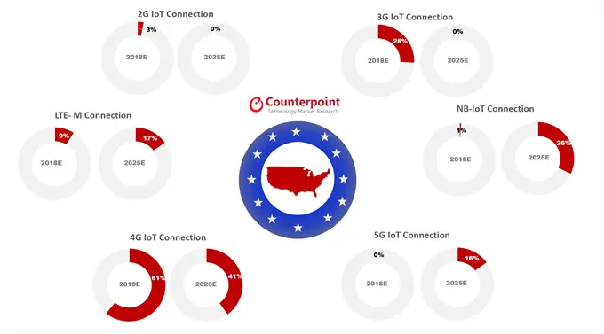2025年美国物联网蜂窝连接:LPWAN占近半 5G应用显著增加至16%