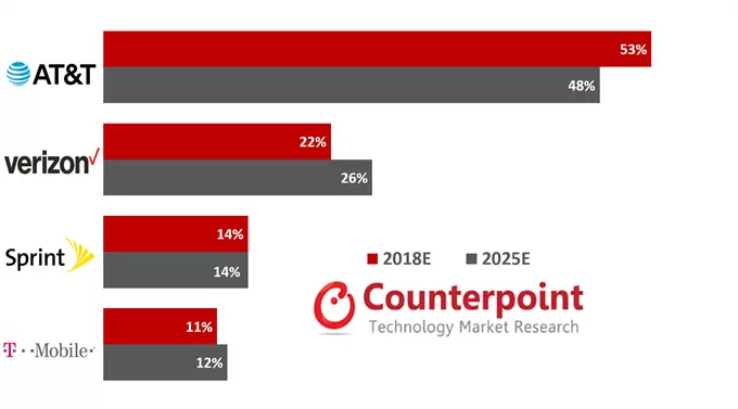 美国电话电报公司(AT&T)将继续主导市场,占美国全部物联网蜂窝数据连接总量的近50%。德国电信(T-Mobile)与斯普林特(Sprint)的潜在合并将使他们2025年在美国排名第二,威瑞森通讯(Verizon)因此屈居第三。