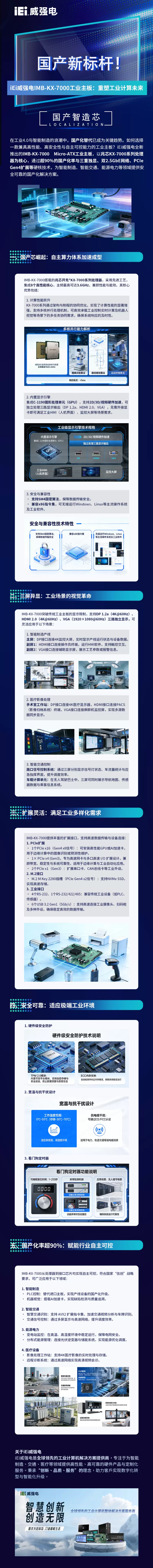 在工业4.0与智能制造的浪潮中,国产化替代已成为关键趋势。如何选择一款兼具高性能、高安全性与自主可控能力的工业主板?iEi威强电全新推出的IMB-KX-7000Micro-ATX工业主板,以兆芯KX-7000系列处理器为核心,通过超90%的国产化率与三重独显、双2.5GbE网络、PCleGen4扩展等硬核技术,为智能制造、智能交通、能源电力等领域提供安全可靠的国产化解决方案。