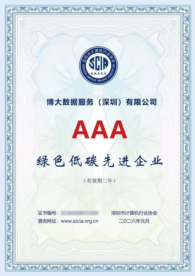 近日,深圳市计算机行业协会正式发布2025年度行业荣誉认定结果,博大数据凭借其在绿色低碳与可持续发展领域的卓越实践,成功获选“绿色低碳先进企业”。该奖项是对企业在节能降耗、环境保护、智能化运营等方面领先成效的权威认可,标志着博大数据在构建高效、清洁、低碳的数字基础设施道路上迈出了坚实一步。此次评选旨在表彰行业标杆,博大数据的入选,正是对其将绿色理念深度融入战略核心、贯穿于技术研发、产品设计与运营管理全环节的充分肯定。