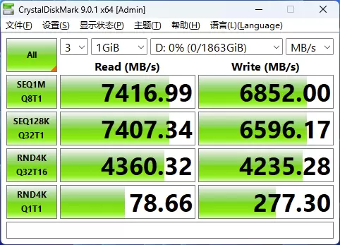 下图是AMD锐龙7000平台上的CrystalDiskMark测速成绩,顺序读取速度达到7400MB/s以上。