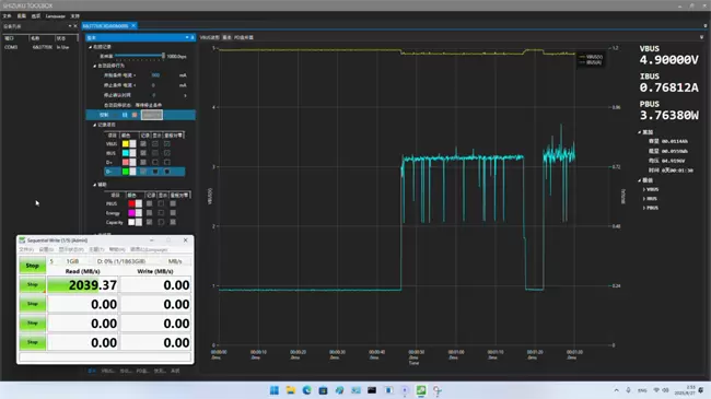 接下来是功耗测试环节,将SSD安装到USB 3.2 Gen2x2移动硬盘盒中,然后通过USB功耗仪分析SSD在待机和顺序读取、顺序写入这三种情况下的功耗表现。由于硬盘盒的桥接芯片并不支持节能特性,而且测得的功耗中包括了硬盘盒自身消耗,所以数值会高于实际使用环境。