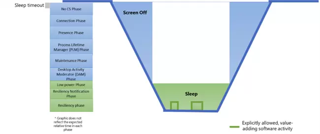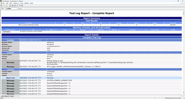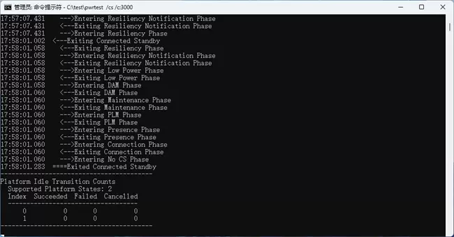 PwrTest会控制电脑完成现代待机各个阶段的进出测试,从No CS阶段(屏幕关闭后开始),连接阶段(确认没有远程桌面会话),线程生命周期PLM阶段(暂停所有前台Microsoft Store应用),维护阶段(执行系统维护任务),桌面活动调节器DAM阶段(暂停所有桌面应用),低功耗阶段(通知进入低功耗长恢复延迟阶段),弹性通知阶段(通知网络子系统进入低功耗模式),最后到达弹性阶段(DRIPS,即最深运行时空闲电源状态)。